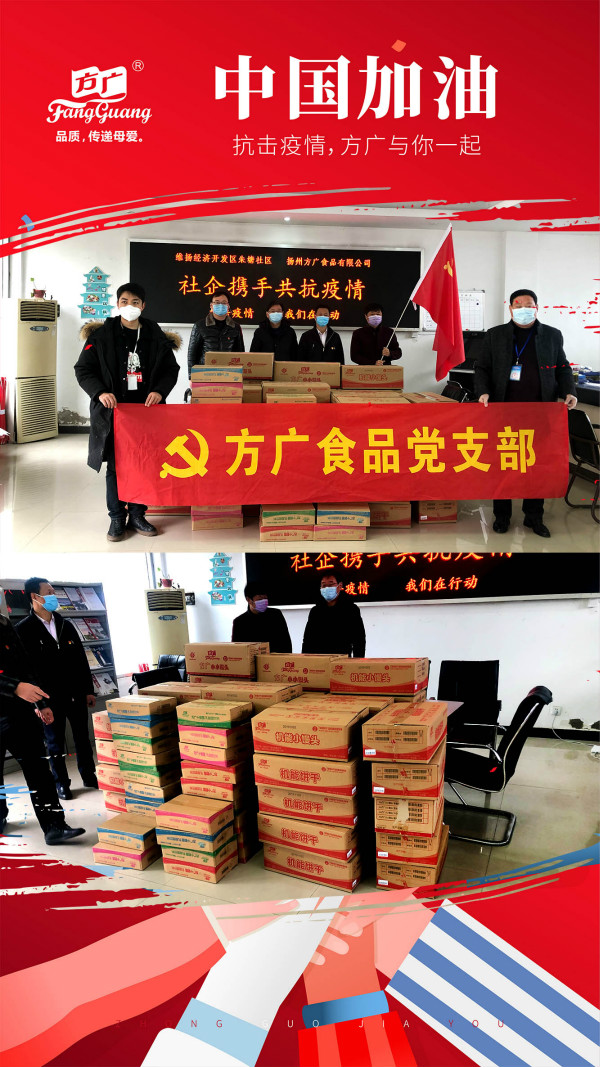 2020年2月12日上午,揚(yáng)州方廣黨支部書(shū)記、總經(jīng)理易森炎一行4人,帶著價(jià)值6萬(wàn)元的方廣乳酸菌飲料、小饅頭、餅干等慰問(wèn)品,分別來(lái)到維揚(yáng)經(jīng)濟(jì)開(kāi)發(fā)區(qū)朱塘社區(qū)、石油山莊社區(qū)和西湖鎮(zhèn)金槐村、中心村,慰問(wèn)奮戰(zhàn)在“在新型冠狀病毒肺炎”抗疫一線的社區(qū)黨員志愿服務(wù)隊(duì)隊(duì)員,為他們送上一份愛(ài)心和溫暖。